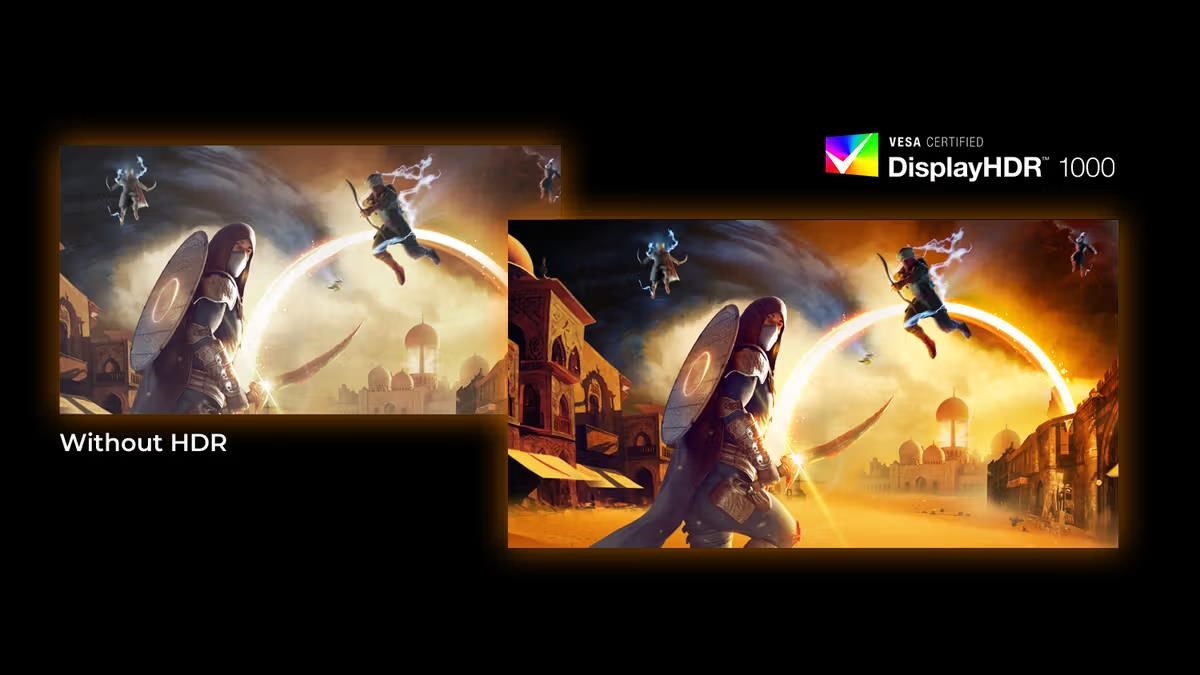 Certifikace Vesa DisplayHDR™ 1000 přináší dramaticky odlišný vizuální zážitek. Na rozdíl od jiných obrazovek s označením „HDR kompatibilní“, skutečné DisplayHDR™ 1000 produkuje úžasný jas, kontrast a barvy. Za pomoci lokálního stmívání a velmi vysokého špičkového jasu až 1000 nitů obrazy ožívají s pokročilými světly a hlubšími, prokreslenějšími odstíny černé. Vykresluje širší paletu bohatých nových barev a přináší vizuální zážitek, který zapojí všechny vaše smysly.