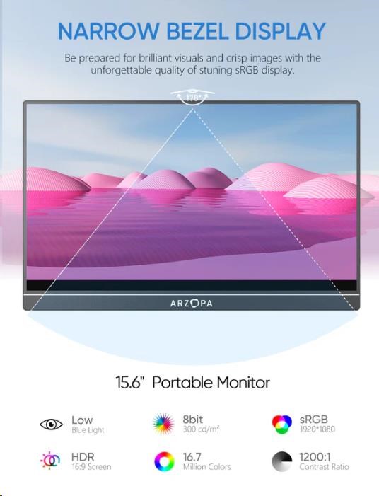 A1 je nejen praktické zařízení, ale také zařízení pro pohodlí. Přenosný monitor Arzopa bude ideální pro hraní her, studium, sledování filmů nebo práci. Díky jeho lehké konstrukci si jej budete moci snadno vzít s sebou na jakýkoli výlet! Užijte si vynikající kvalitu obrazu, ať jste kdekoli!