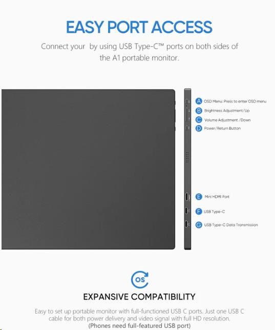 Monitor Arzopa vykazuje skvělou kompatibilitu, takže jeho používání bude velmi pohodlné. Je totiž vybaven portem Mini HDMI a dvěma porty USB-C. Bude dokonale fungovat s různými modely telefonů, notebooků, ale i konzolí, jako je Switch, Xbox a PS4.