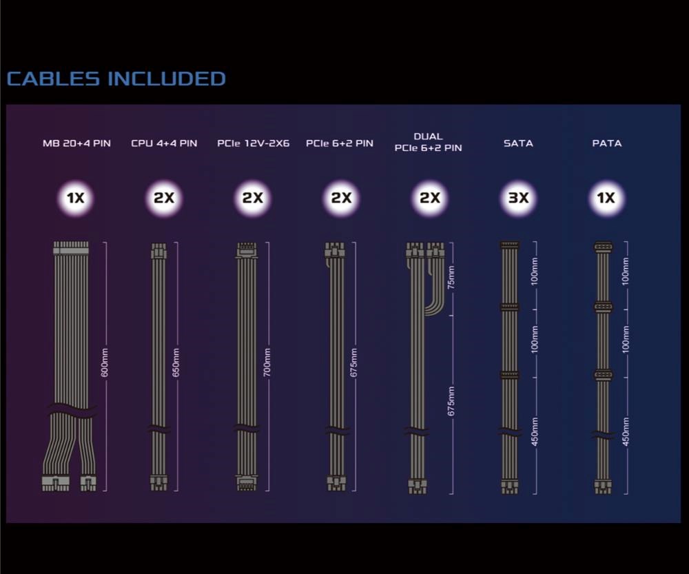 Formát zdroja:ATX; Konektory:8pin CPU 1x, PCIe 8-pin, SATA 15-pin, Molex; Konektory pre základnú dosku:ATX 24-pin; Vlastnosti zdroja:Modulárna kabeláž