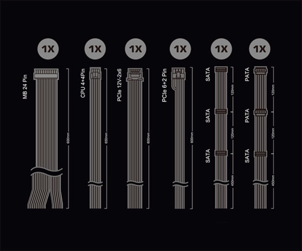 Formát zdroja:ATX; Konektory:8pin CPU 1x, PCIe 6-pin, PCIe 8-pin, PCIe 16-pin Gen5, SATA 15-pin, Molex; Konektory pre základnú dosku:ATX 24-pin, EPS 8-pin