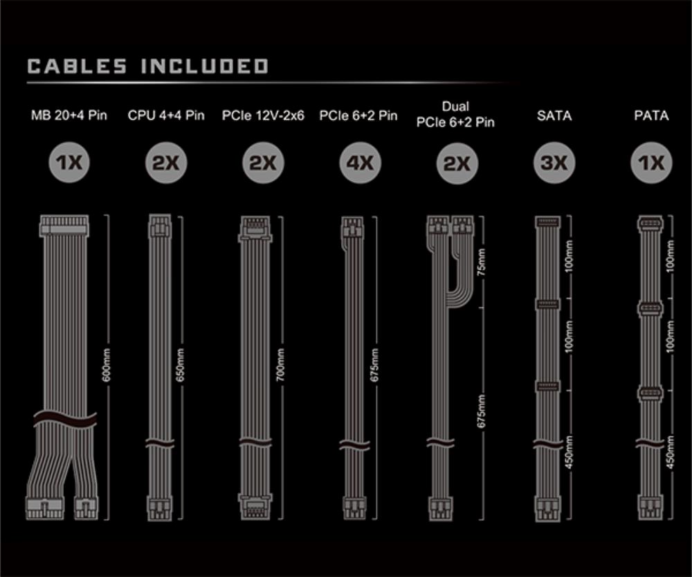 Formát zdroja:ATX; Konektory:8pin CPU 1x, PCIe 8-pin, SATA 15-pin, Molex; Konektory pre základnú dosku:ATX 24-pin; Vlastnosti zdroja:Modulárna kabeláž
