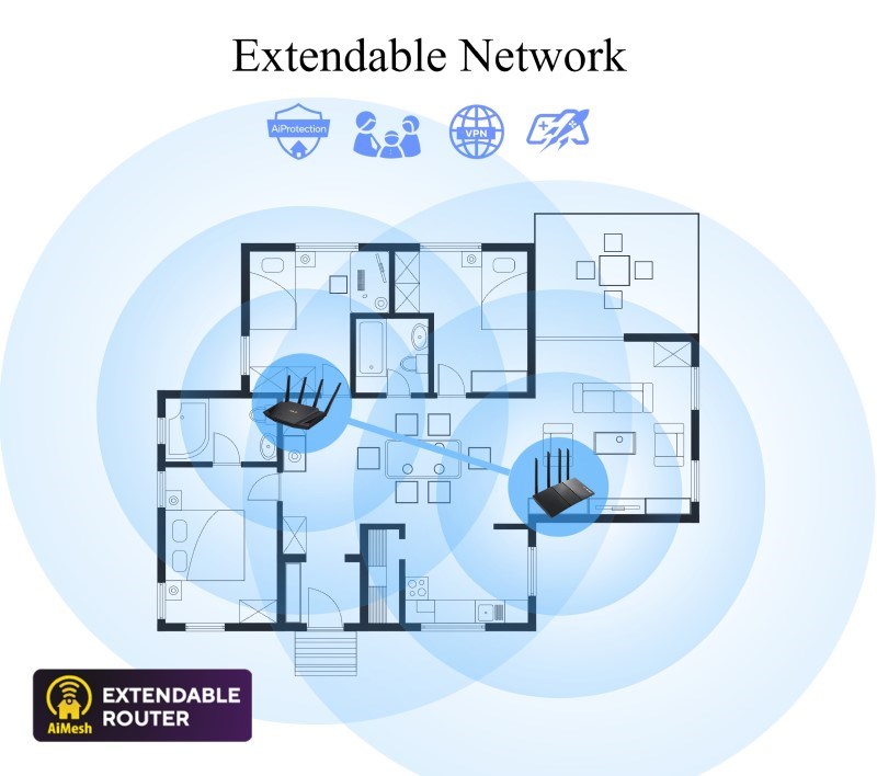 Štandard WiFi 6 novej generácie - 802.11ax WiFi pre lepšiu efektivitu a priepustnosť. .Ultrarýchla rýchlosť WiFi - 12-prúdová rýchlosť WiFi 6000 Mb/s, ktorá si hravo poradí aj s najvyťaženejšou sieťou. .Dva porty 10G - Vychutnajte si až 10-násobne vyššiu rýchlosť prenosu dát pre úlohy náročné na šírku pásma vďaka sieťovým portom 10GBase-T a 10G SFP+. Širšie využitie a väčšie pohodlie - 8 antén + 8 portov LAN na podporu viacerých klientov súčasne. Zabezpečenie na komerčnej úrovni - AiProtection Pro od spoločnosti Trend Micro™ blokuje internetové bezpečnostné hrozby pre všetky vaše pripojené inteligentné zariadenia. Lepší partner so systémom Mesh - Kompatibilný so systémom ASUS AiMesh WiFi pre bezproblémové pokrytie celej domácnosti. 12-stream AX6000 Dual Band WiFi 6 (802.11ax) Smerovač 802.11ac : až 1000 Mb/s 802.11ac (5GHz) : až 4333 Mb/s 802.11ax (2.4GHz): až 1300 Mb/s 802.11ax (5 GHz): až 4804 Mb/s OFDMA + MU-MIMO, 1024 QAM,.
