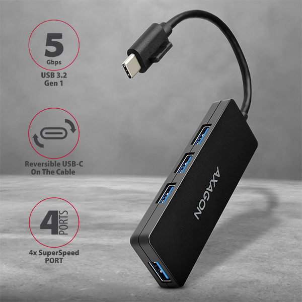 AXAGON HUE-G1C, 4x USB 3.2 Gen 1 SLIM hub, pevný 14 cm kábel Type-C