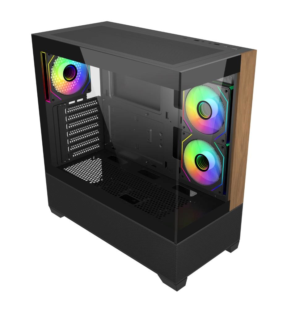 Model Elite 690 má čistý a moderný dizajn a je vybavený dvomi panelmi z tvrdeného skla na prednej a bočnej strane, ktoré prezentujú prémiové komponenty a RGB osvetlenie. Predný panel kombinuje prírodný akcent s textúrou dreva so spodným nasávaním zo sieťoviny, čo prináša estetickú teplo a efektívne prúdenie vzduchu. Vďaka rozsiahlému vetraniu na hornej a dolnej strane podporuje skriňa univerzálne konfigurácie ventilátorov a chladičov, ktoré umožňujú výkonné vertikálne chladenie. Či už staviame vysoko výkonnú prezentačnú zostavu alebo štýlovú stolnú zostavu, Elite 690 poskytuje dokonalú rovnováhu medzi funkčnosťou a formou.