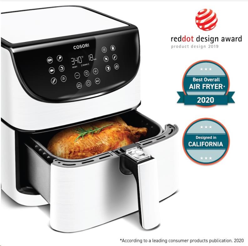 Dizajn teplovzdušnej fritézy COSORI CP158-AF bol navrhnutý v Kalifornii. Vďaka svojej praktickosti, funkciám, ovládaniu aj prehľadnému dotykovému naklonenému LED displeju sa ľahko prístupnými tlačidlami získal aj prestížne ocenenie Red Dot Award za najlepší dizajn.