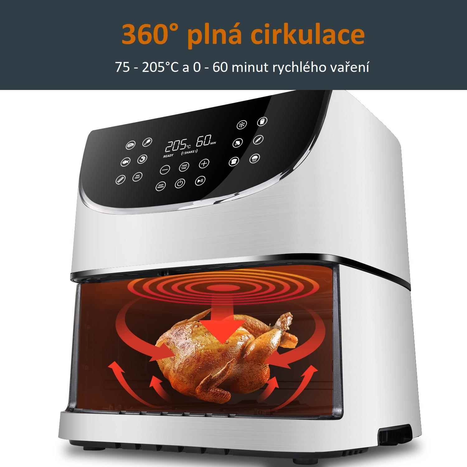Horúci vzduch rotuje okolo jedla zo všetkých strán a tým dosahuje kvalitné a rovnomerné prepečenie a uvarenie pokrmov. Vďaka tejto technológii sa fritéza predohreje behom 5 minút.