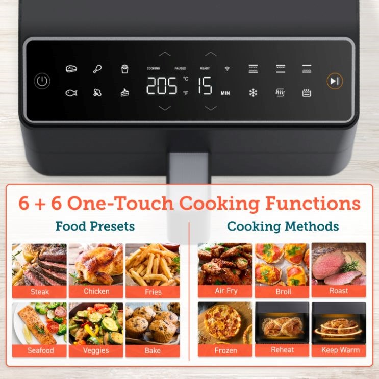 BAZAR - Cosori Dual Blaze 6.4L SMART horkovzdušná fritéza + 5x špíz a gril. rošt, black - pošk. obal