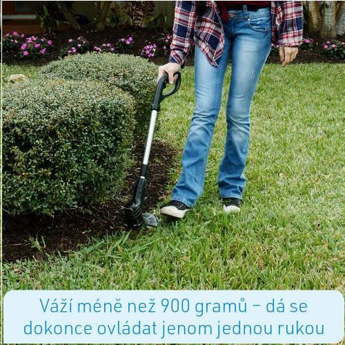 Bionic Trimmer je ultra lehký, dobíjetelný, používáte jej bez kabelu, tedy je jeho použití v zahradě absolutně flexibilní. Na jeho obsluhu stačí jedna ruka, je lehký jako pírko, váží méně než 900 gramů.
