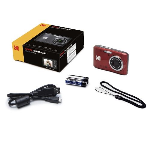 Obsah balenia: | KODAK FZ45 2x AA alkalické batérie Micro USB kábel Náramok na ruku Rýchly sprievodca |