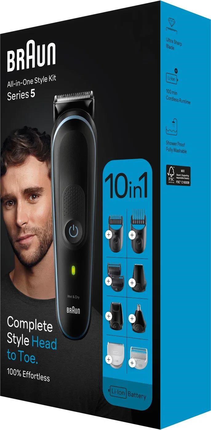Braun All-In-One Series 5 MGK5445 zastřihovač, vlasy, vousy a chloupky, 10v1, baterie, ocelová čepel