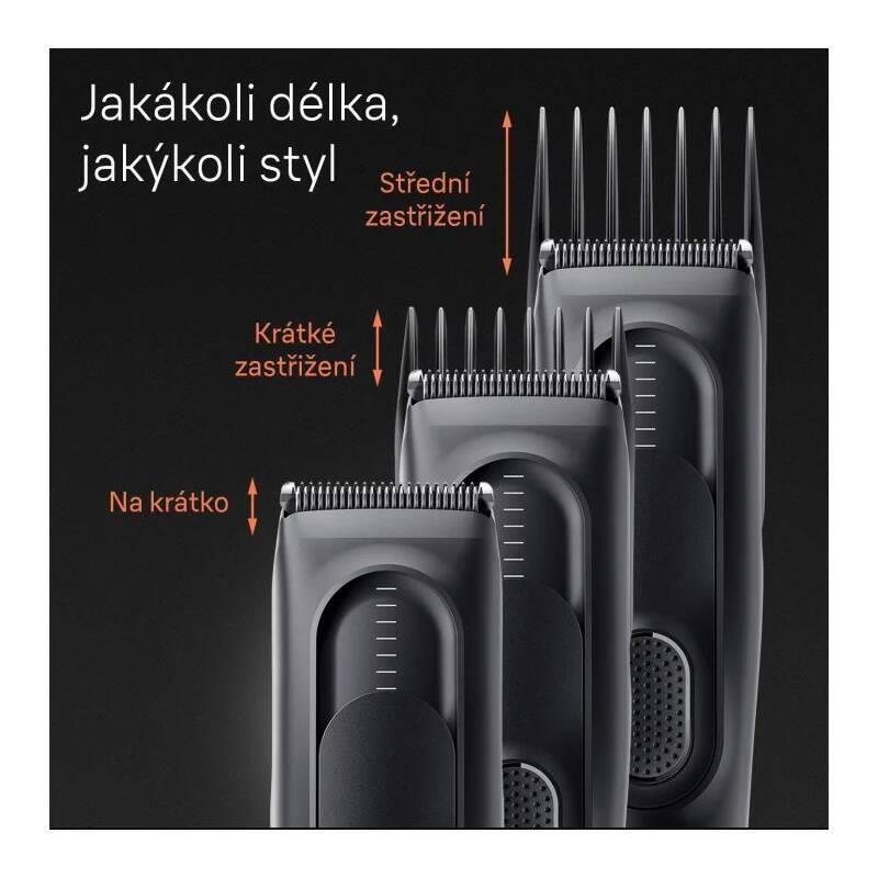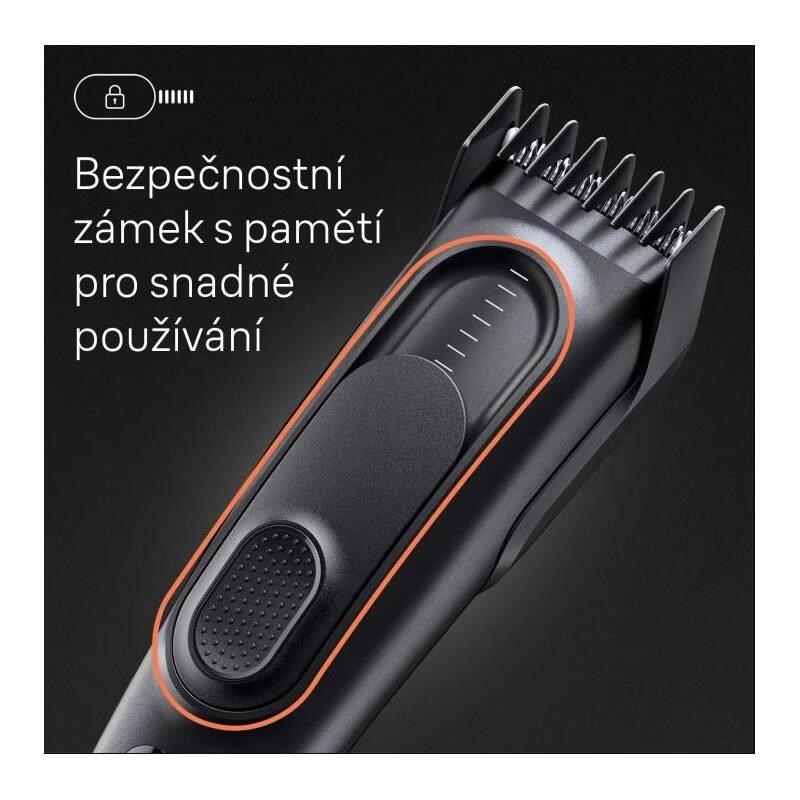Bezpečnostní zámek Memory SafetyLock navíc uzamkne poslední nastavení. Po použití jej zbavíte nečistot jednoduše pod proudem vody. Součástí balení je kromě samotného zastřihovače vlasů praktické příslušenství, které vám usnadní práci. Těšit se můžete na malý hřeben (3–24 mm), velký hřeben (14–35 mm) a nabíjecí kabel.