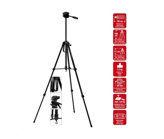Lehký hliníkový foto/video statív, 3-smerná hlava s výmennou destičkou, vodováha, 3 segmenty nôh so svorkami, profil 26mm, zaťaženie maximálne 5kg, rozmery: zložený 59cm / výška 57-160cm, hmotnosť 1200g, farba čierna, vrátane puzdra. Stredový stĺpik so vzperami pre vyššiu stabilitu, nastavenie výšky kľúčom, háčik na povešenie príslušenstva alebo závažia, plastové ucho pre transport, nohy zakončené gumou.Popis produktu bol preložený pomocou umelej inteligencie a môže obsahovať nepresnosti.