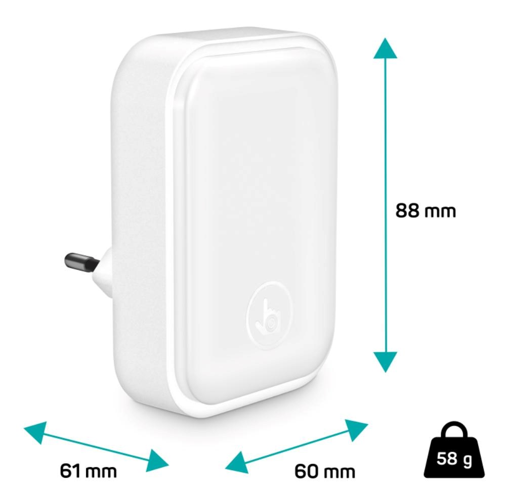 Světlo disponuje touch tlačítkem, které umožňuje zapnout/vypnout světlo a nastavit jas světla ve 3 úrovních. Světlo stačí jednoduše zapojit do libovolné zásuvky a při příkonu 0,65 W se nemusíte bát spotřeby elektrické energie. LED zdroj světla disponuje světelným tokem 30 lumenů.