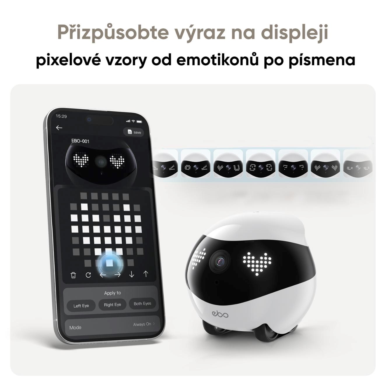 EBO Air 2 má dvojicu pixelových displejov, ktoré simulujú oči a dávajú mu priateľský, hravý charakter. Tieto animované oči môžu meniť výrazy podľa situácie – pri nabíjaní, pohybe alebo komunikácii. Používateľ si môže prispôsobiť vzhľad očí podľa nálady či prostredia. Tento detail z neho robí nielen chytrú kameru, ale aj sympatického spoločníka pre celú rodinu.