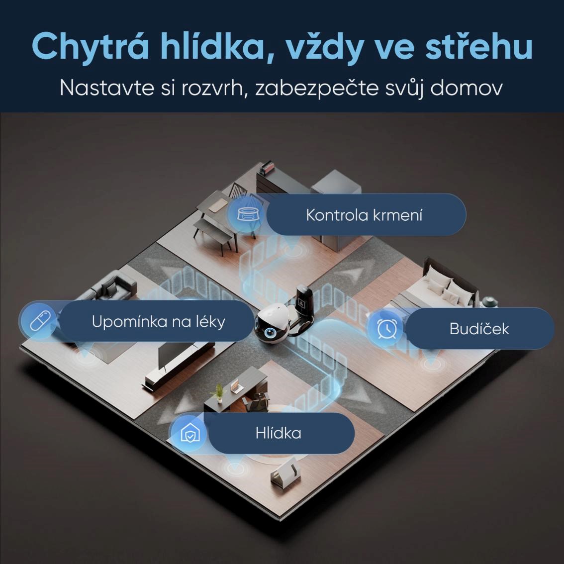 - Užívateľsky prívetivá mobilná aplikácia – jednoduché ovládanie, prístup k živému videu, ukladanie záznamov a kompletná správa všetkých funkcií v jednom rozhraní. Viacerí používatelia môžu zdieľať jedného robota v aplikácii.