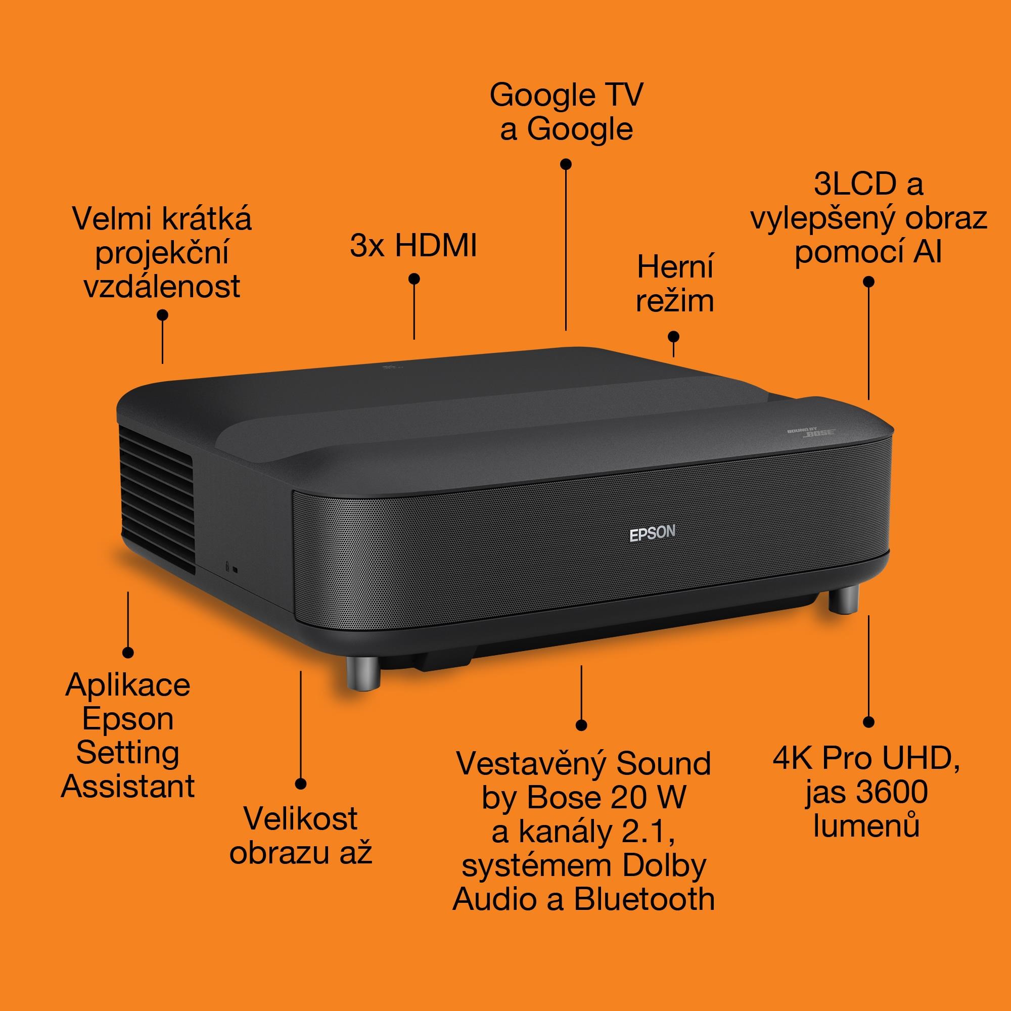 Použitie projektora: Domáce kino / hranie hier / streamovanie / televízie a set-top boxy; Typ projekcie: Ultra Short Throw (UST); Skutočné rozlíšenie projektora: 4K PRO-UHD (3840 × 2160); Projekčný pomer: 16:9; Projekčná vzdialenosť (min) (m): 0,3; Projekčná vzdialenosť (max) (m): 0,7; Uhlopriečka obrazu (max) ("): 120; Technológia: 3LCD (RGB so uzávierkou s kvapalnými kryštálmi C2 Fine); Zdroj svetla: Laser (životnosť až 20 000 h); Kontrast (hodnota : 1): 5 000 000; Jas (ANSI luse +) Dolby Audio + Bluetooth (20 W 2.1 kanálový systém);