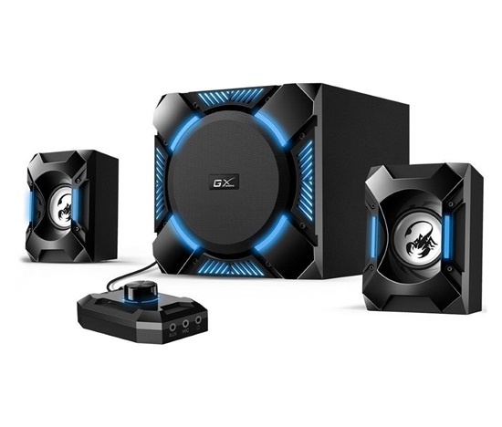 Dizajnové herné reproduktory v konfigurácii 2.1 s celkovým výkonom 36 W. Prítomný zosilňovač disponuje ovládaním hlasitosti, vďaka ktorému si môžete vychutnať hlasitý zvuk podľa vlastného želania, sluchátkovým výstupom a vstupom pre mikrofón. Herný dizajn dopĺňa modré podsvietenie.