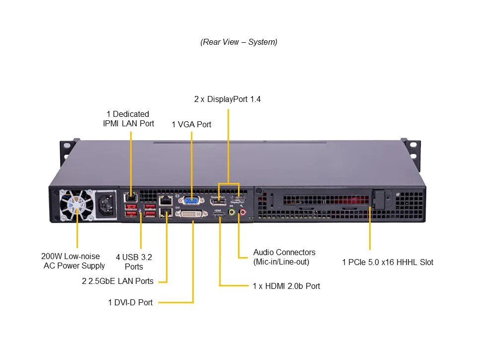 SYS-111AD-HN2-02-G1 CPU: Core i7-12700E Pamäť: 1x 32GB DDR5-4800 Úložisko: 1x 1.9TB 2,5" SATA Sieť: 2x 1G RJ45 1U krátka hĺbka predochondia I/O, 2 hot-swap 2,5" SATA disky, 1x PCIe 5.0 x16 (HHHL)Popis produktu bol preložený pomocou umelej inteligencie a môže obsahovať nepresnosti.