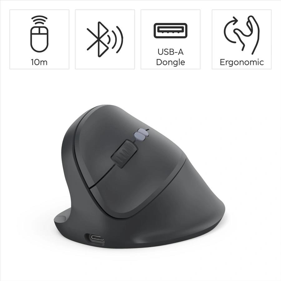 - 8-tlačidlová ergonomická bezdrôtová optická myš s voliteľným pripojením na tri zariadenia: 1x bezdrôtový USB prijímač a 2xBluetooth- vertikálne prevedenie predchádza presileniu a bolesti ramien a zápästí