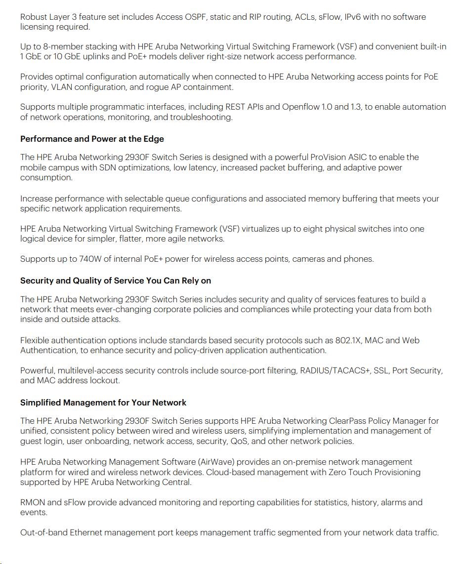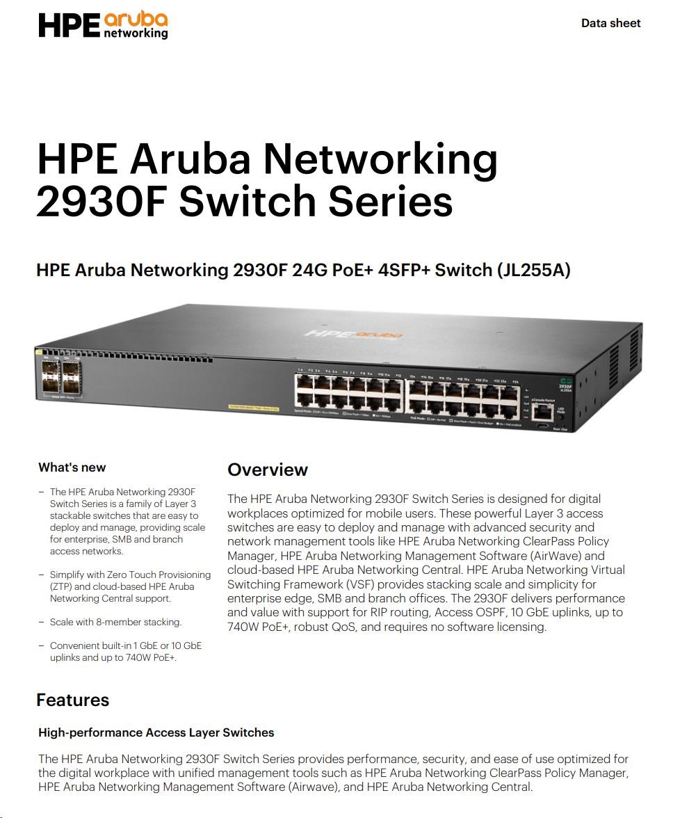Řada přepínačů HPE Aruba Networking 2930F je navržena pro digitální pracoviště optimalizovaná pro mobilní uživatele. Tyto výkonné přístupové přepínače vrstvy 3 se snadno nasazují a spravují pomocí pokročilých bezpečnostních a nástrojů pro správu sítě, jako jsou HPE Aruba Networking ClearPass Policy Manager, HPE Aruba Networking Management Software (AirWave) a cloudové řešení HPE Aruba Networking Central. HPE Aruba Networking Virtual Switching Framework (VSF) poskytuje škálovatelnost stohování a jednoduchost pro podnikové okraje sítě, SMB a pobočky. Model 2930F nabízí výkon a hodnotu díky podpoře směrování RIP, Access OSPF, 10GbE uplinkům, až 740 W PoE+, pokročilému QoS a nevyžaduje žádné softwarové licence.