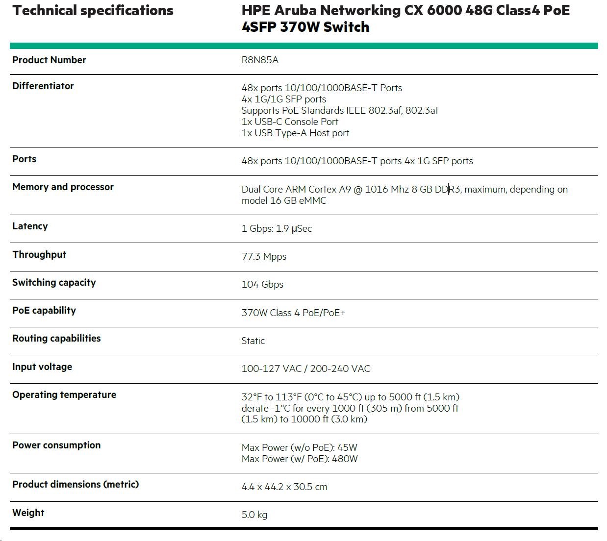 HPE Aruba Networking CX 6000 48G Class4 PoE 4SFP 370W Switch