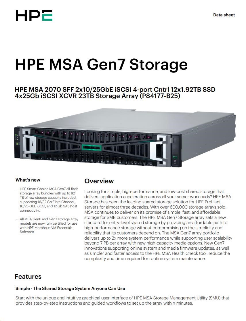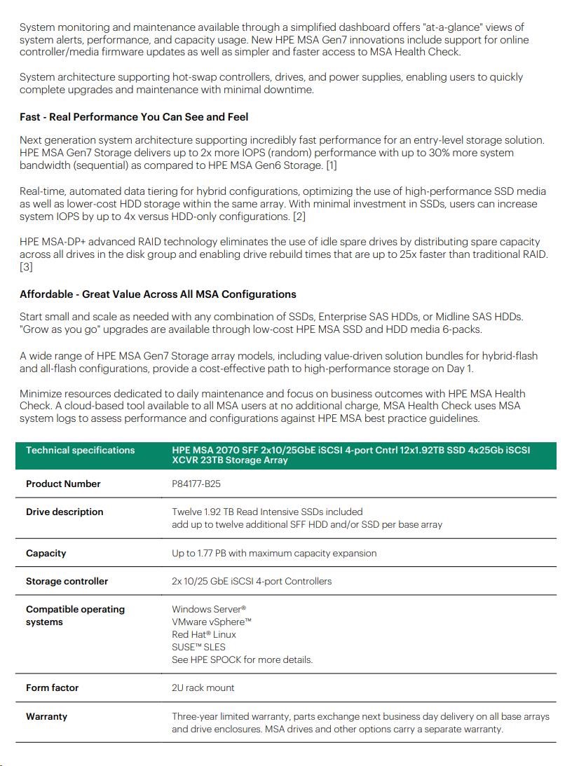 HPE MSA 2070 SFF 2x10/25GbE iSCSI 4-port Controller 12x1.92TB SSD 4x25Gb iSCSI XCVR 23TB Storage Array Smart Choice