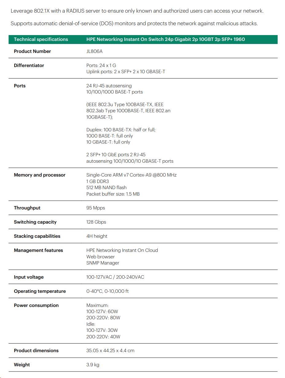 The Instant On Differentiators The Aruba Instant On mobile app allows you to set up, manage, and monitor Instant On switches and access points directly from your phone. Within the app, you get guided step-by-step instructions to install Instant On devices to get your network up and running quickly - no technical expertise required. And cloud-based access allows you to access the network from anywhere, at any time. Cloud-Managed Stacking The Aruba Instant On mobile app and cloud-based web portal make cloud-managed stacking easy - just follow the recommendations to stack up to four (4) 1960 switches and manage as a single entity. The Instant On mobile app automatically detects members, making multiple stack members easy to setup and manage remotely. Automated configurations and streamlined workflows allow users to manage all stack members through one single dashboard without the need for device reboot. Luggage Tag Each switch has a pull-out tag, known as a luggage tag, on the front panel of the switch. The tag includes a QR code that includes switch ID information (SKU number, SKU name, serial number, and MAC address) for easy switch onboarding through Instant On mobile app. Non-Intrusive, Aesthetic Design Aruba Instant On switches are designed to complement the sleek and clean look of the Instant On access points, and to blend discreetly into your site's environment. The 8-port models, as well as the 24- and 48-port non PoE+ models, are fan-less, making them ideal for quiet office deployments. High Performance With Flexible Options The series consists of two (2) PoE switches, and two (2) non-PoE switches including 24- and 48-port Gigabit Ethernet switches with two (2) dedicated 10G SFP+ ports and two (2) 10GBASE-T uplink ports on 24-/48- port models. The series also includes a 12-port 10Gbps aggregation switch with four (4) 10G SFP+ ports to meet the bandwidth requirements of small businesses. Optimized User Experience The Aruba Instant On mobile app provides common workflows for Instant On switches and access points making it easier to configure, monitor and manage your network remotely without the need for additional hardware like cloud keys. You can also update firmware on your Instant On devices directly from the cloud whenever you want, from wherever you are. Site Inventory And Topology View The site inventory view shows all Instant On switches and access points on a single interface, and the topology view provides an intuitive structure of all Instant On devices deployed on the network - allowing you to quickly identify non-functioning devices and troubleshoot accordingly. Network issues can be easily diagnosed with connectivity tests like Ping and Traceroute. Multi-Site Remote Management The cloud-hosted web interface and mobile app make it easy to remotely manage multiple sites, multiple networks, distributed deployments and multi-tenant deployments. Each site is logically separated and has its own configuration, statistics, guest portal, and admin read/write privileges. Instant On allows you to create three admin accounts per site, offering the option to lock accounts from accidental deletion or to allow your account to be managed by a trusted partner. Built-In Security Built-in security features protect your network from external threats by blocking malware attacks and keeping unauthorized users off the network. Network traffic can be filtered and access restricted based on MAC and IP address. No Hidden Fees All features are included in the price of the hardware - there are no recurring subscription or licensing fees. Expert-level support and industry leading limited lifetime warranty are also included, along with chat support for the life of the product. |