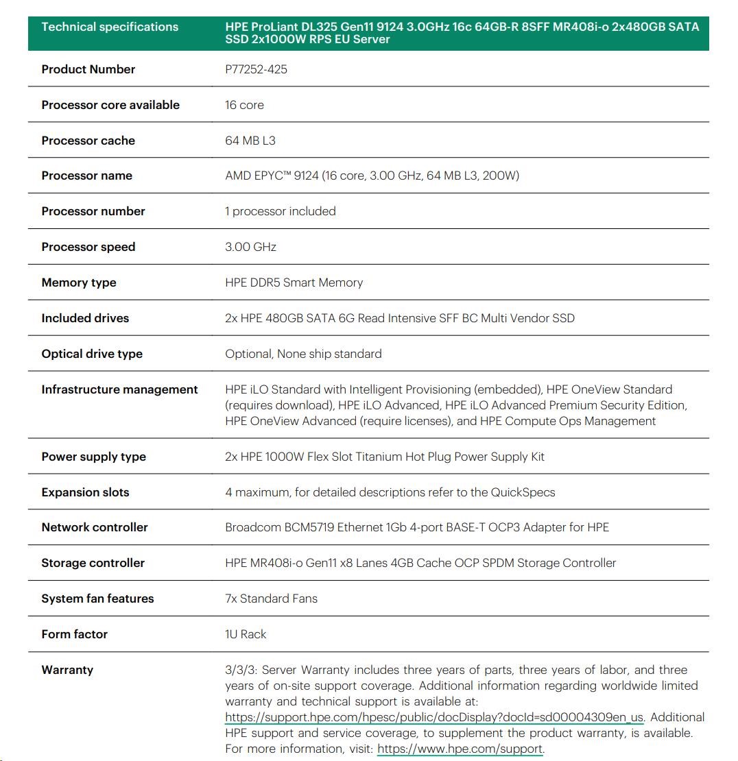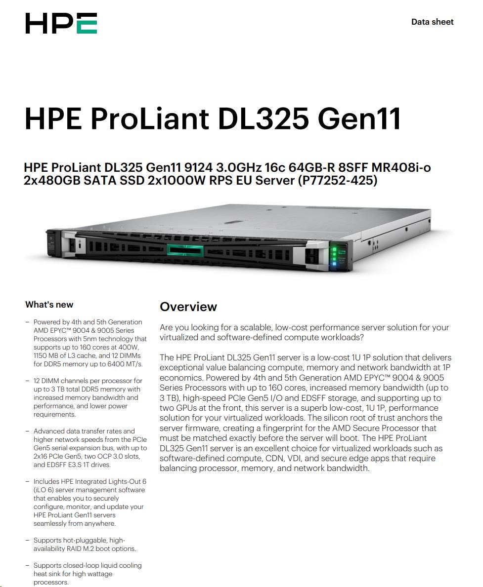 HPE ProLiant DL325 Gen11 9124 3.0GHz 16c 64GB-R 8SFF MR408i-o 2x480GB SATA SSD 2x1000W RPS EU Server |