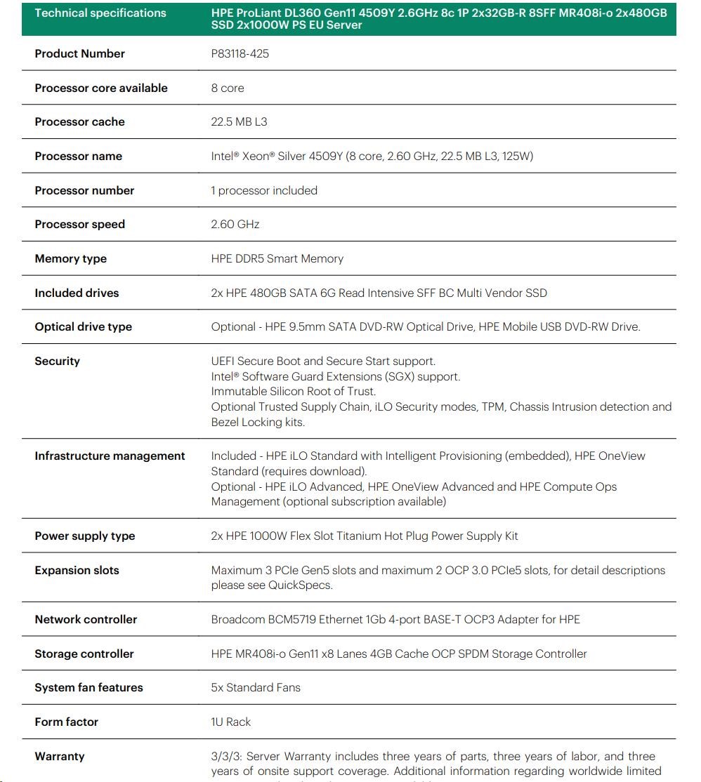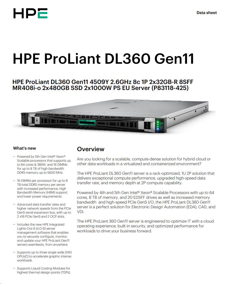 HPE PL DL360g11 4509Y (2.6G/8C) 2x32G (p64706) 2x480G 2x1000W MR408i-o 8SFF 4p1G ocp Smart Choice