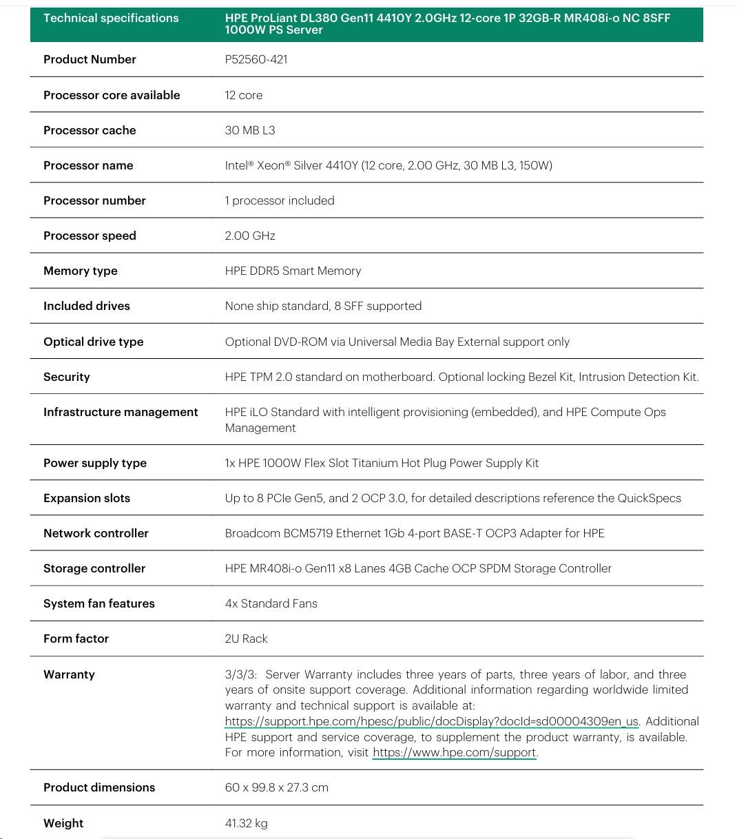 Model Name HPE ProLiant DL380 Gen11 4410Y 2.0GHz 12-core 1P 32GB-R MR408i-o NC 8SFF 800W PS Server