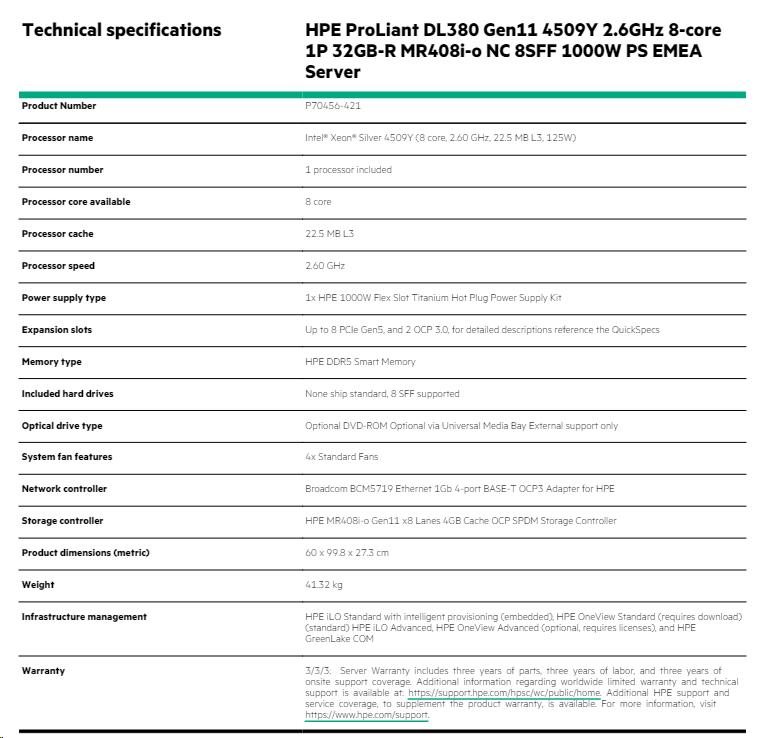 Model Name HPE PL DL380g11 4509Y (2.6/8C/22.5M) 32G MR408i-o/4G 8-26SFF 1000Wti 4x1G NDB333