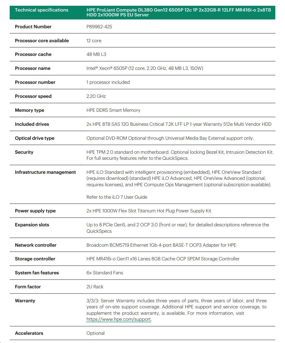 HPE PL DL380g12 6505P (2.2/12C) 2x32G (P69727) 2x8TB MR416i-o 2x1000W 10GbE NBD333 Smart Choice