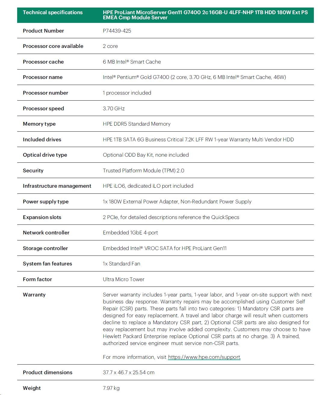 P74439-425: HPE ProLiant MicroServer Gen11 G7400 2c 16GB-U 4LFF-NHP 1TB HDD 180W Ext PS EMEA Cmp Module Server |