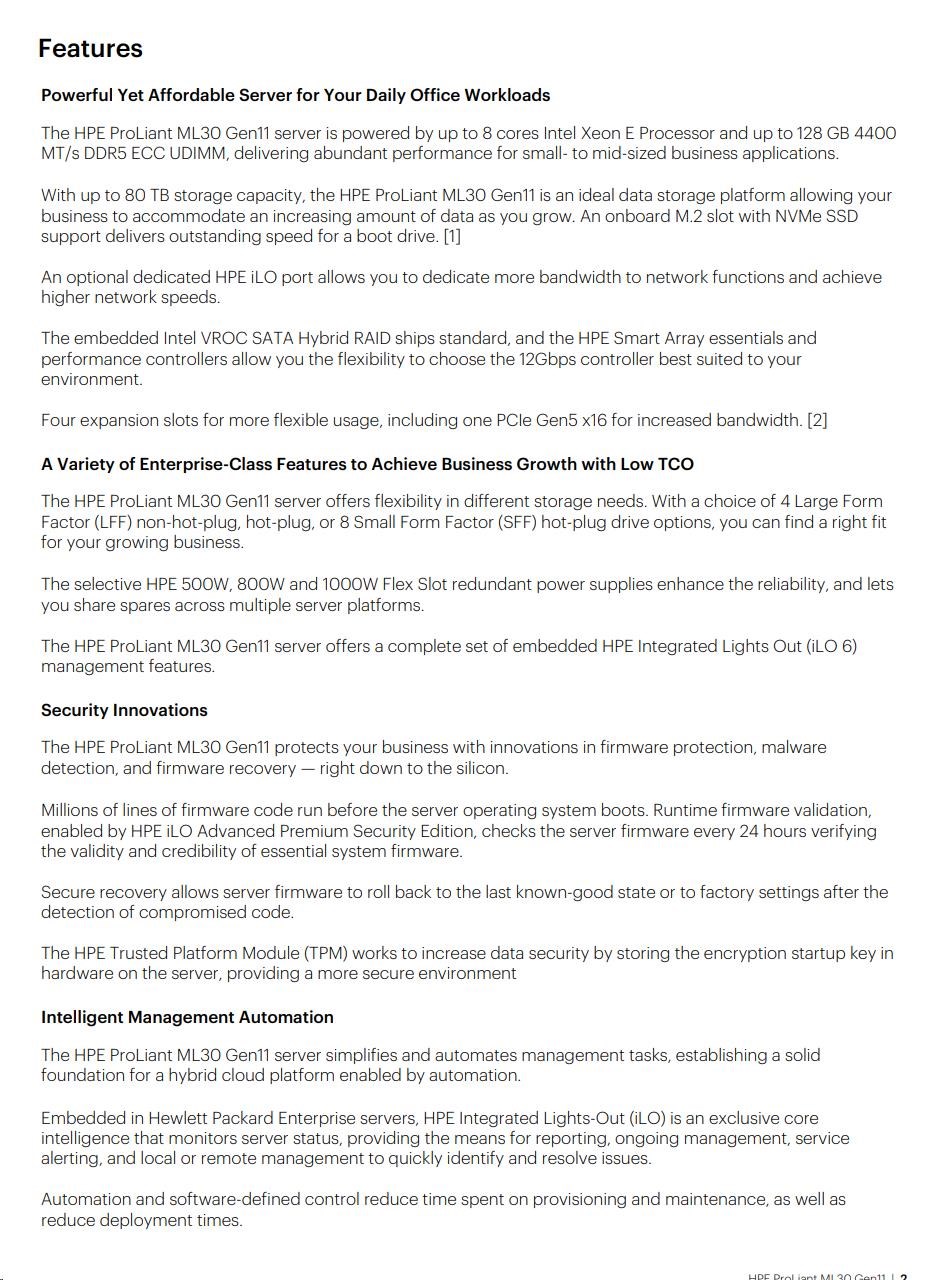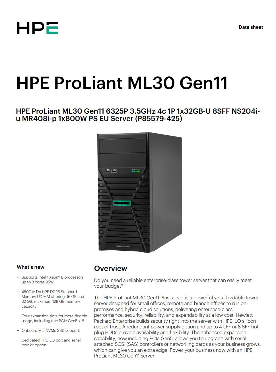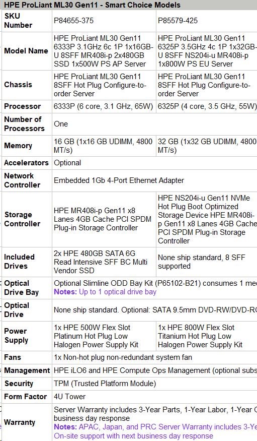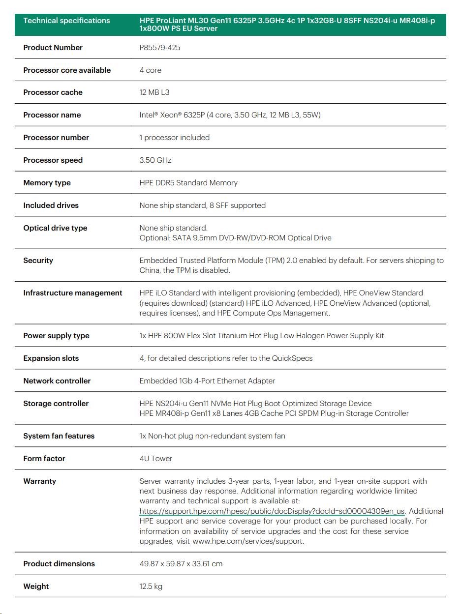 HPE PL ML30 gen11 6325P (3.5G/4C8T) 1x32G 8SFF NS204i-u(2x480g) MR408i-p 2x800W 3/1/1 Smart Choice