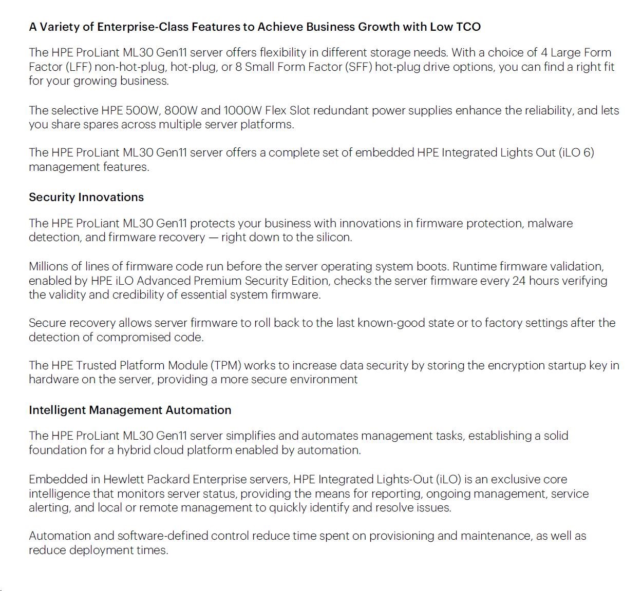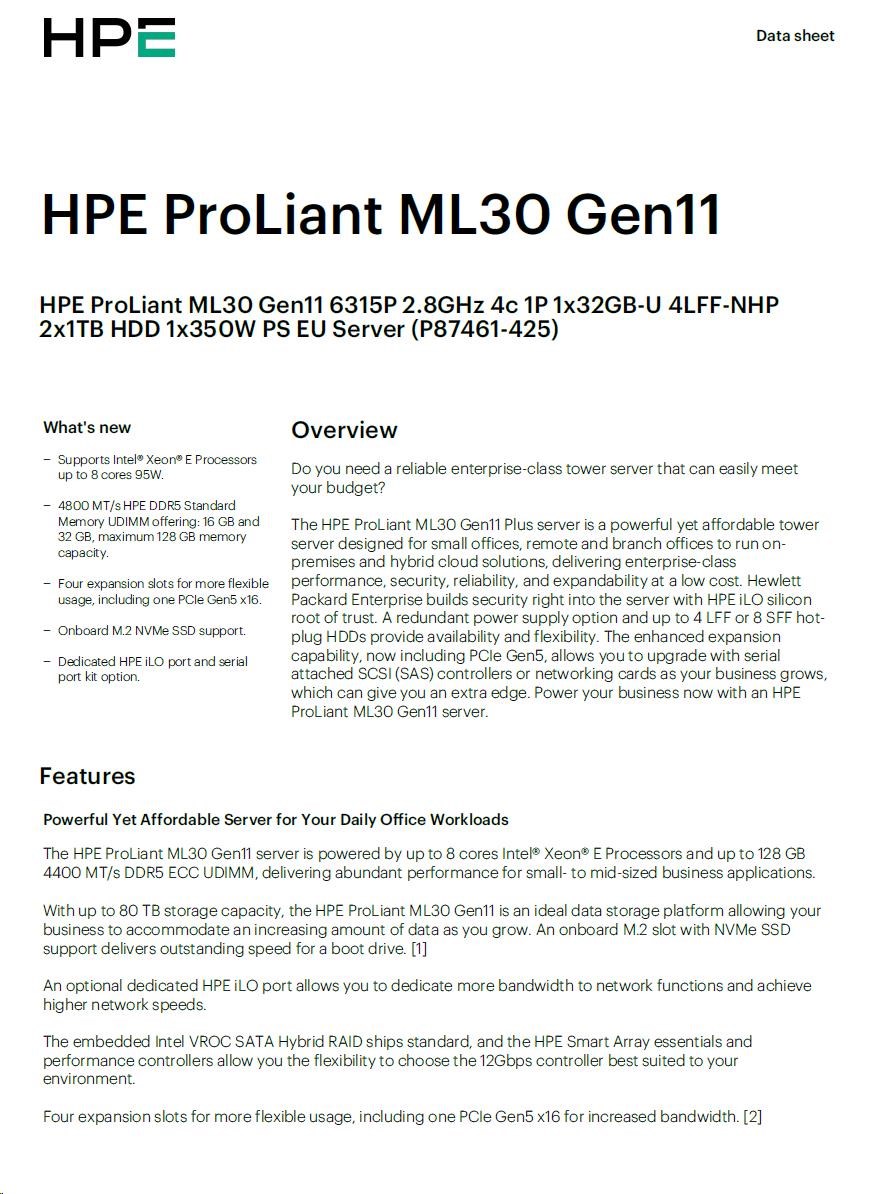 HPE PL ML30g11 6315P (2.8-5.2G/4C4T) 1x32G 2x1TB SATA 4LFF-NHP 1x350 VROC 4p1G NBD311 Smart Choice