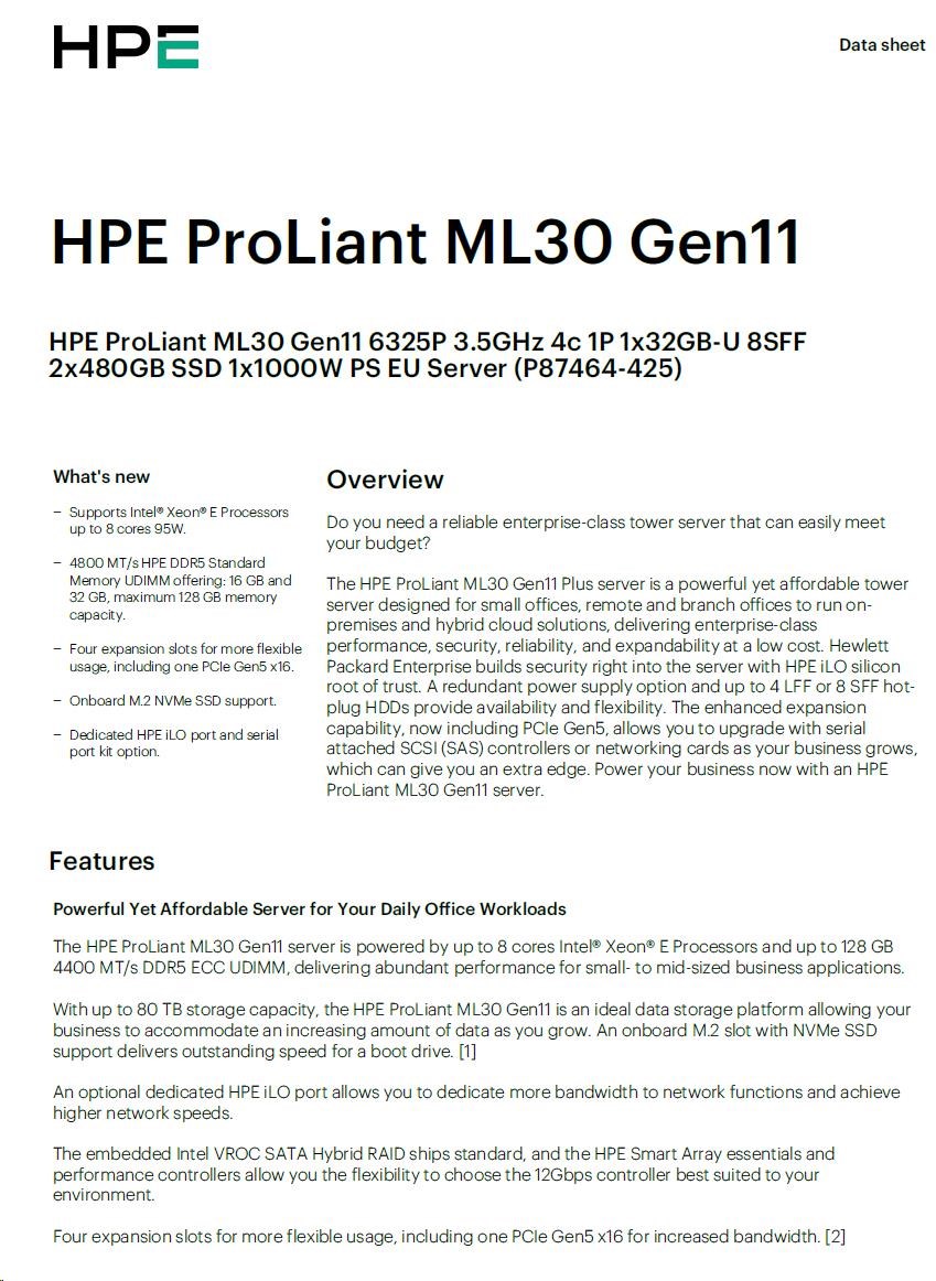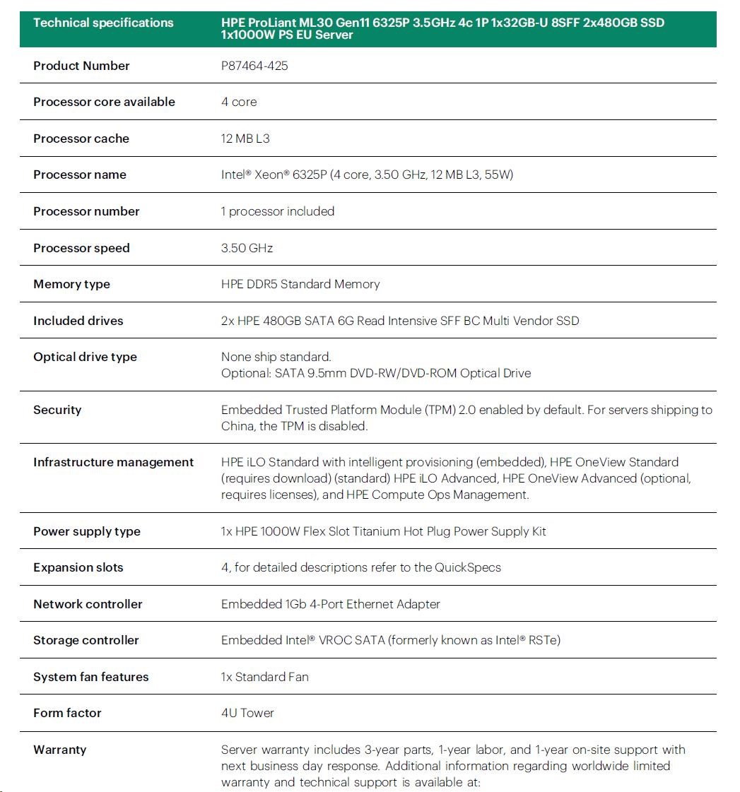 HPE PL ML30g11 6325P (3.5G/4C8T) 1x32G 2x480G SSD 8SFF VROC 1x1000W 4p1G NBD311 Smart Choice