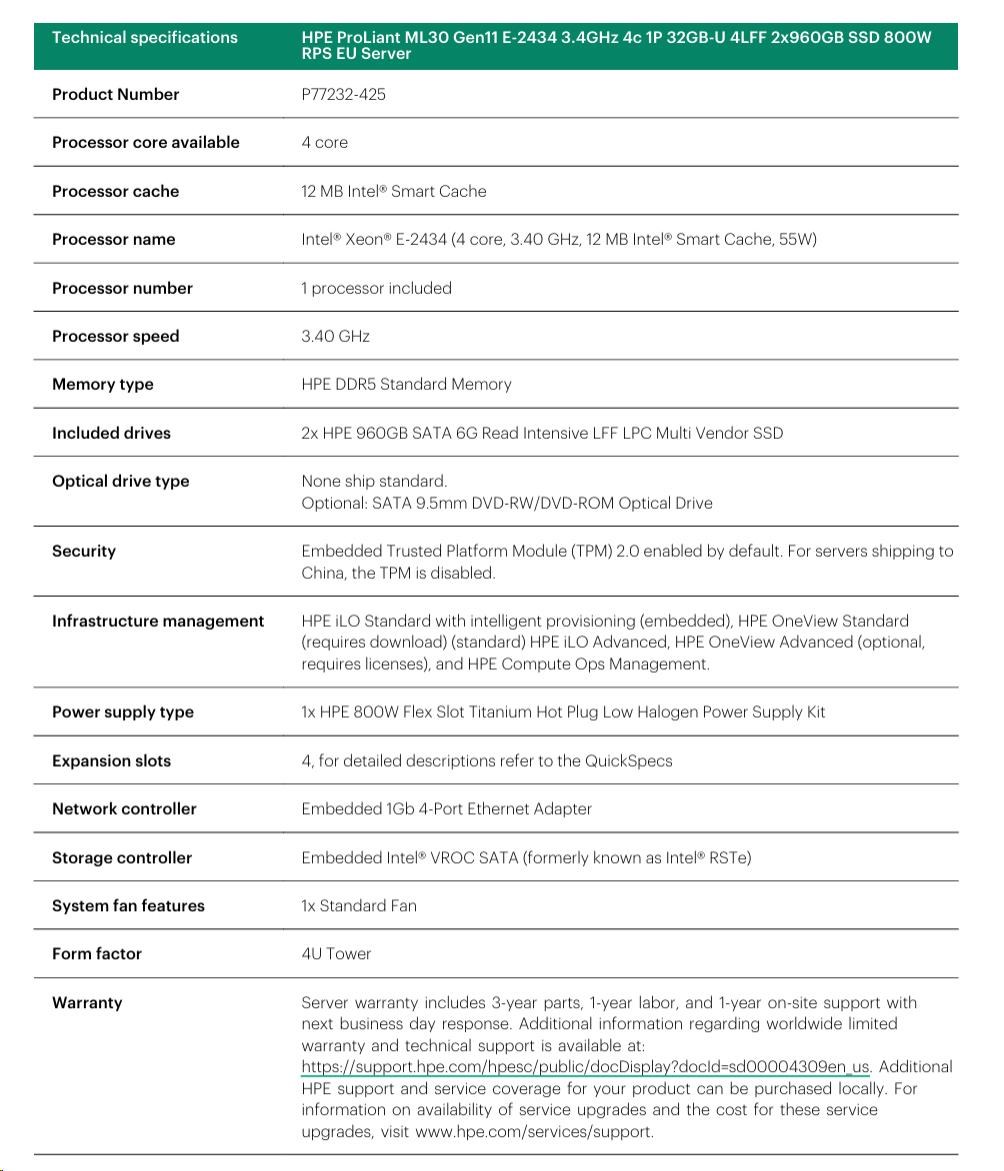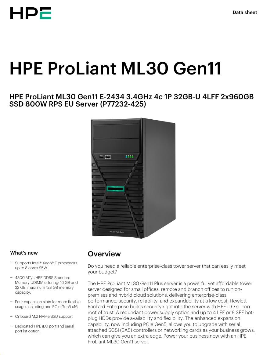 HPE ProLiant ML30 Gen11 E-2434 3.4GHz 4c 1P 32GB-U 4LFF 2x960GB SSD 800W RPS EU Server |