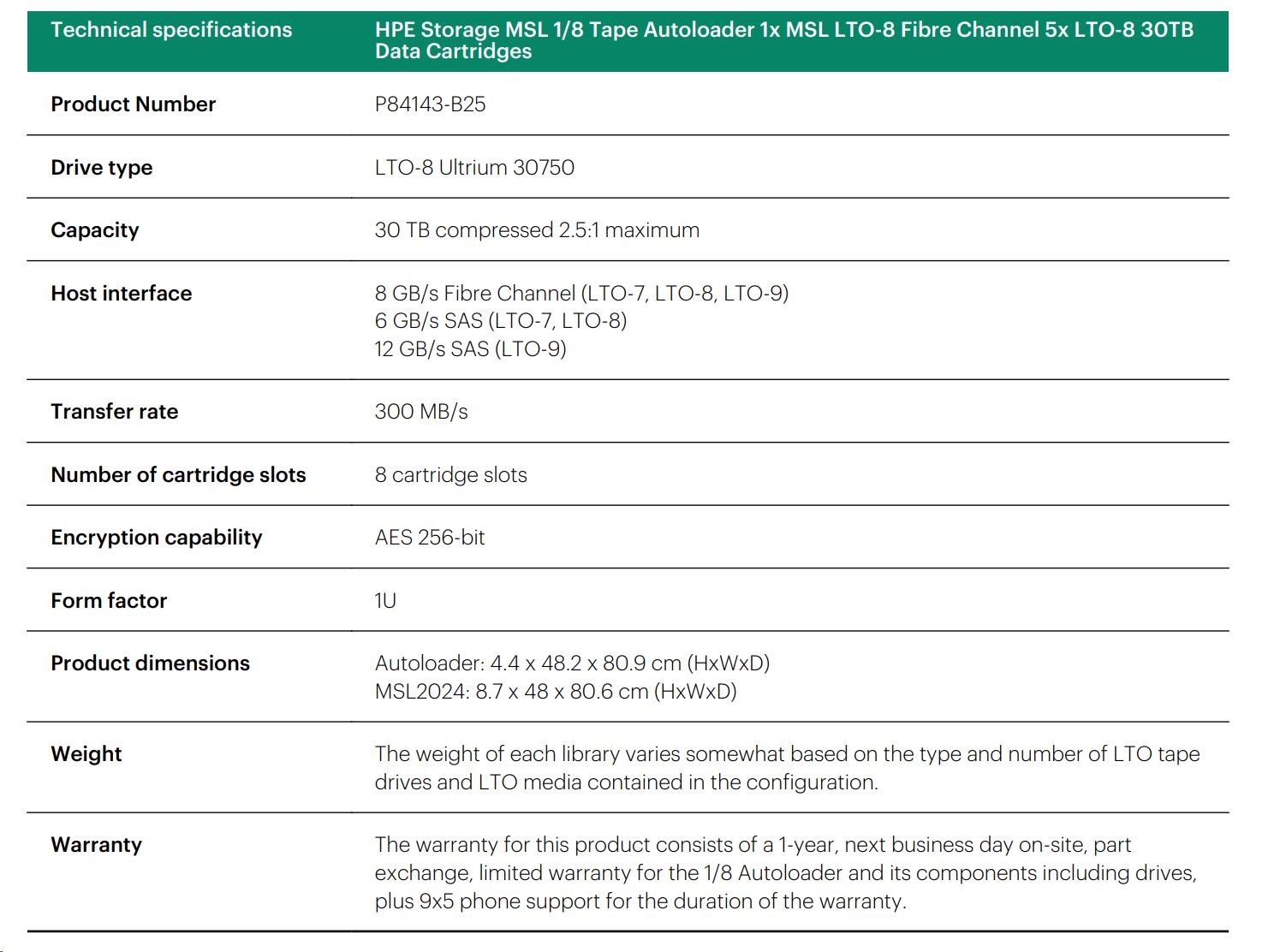 HPE Storage MSL 1/8 Tape Autoloader 1x MSL LTO-8 Fibre Channel 5x LTO-8 30TB Data Cartridges