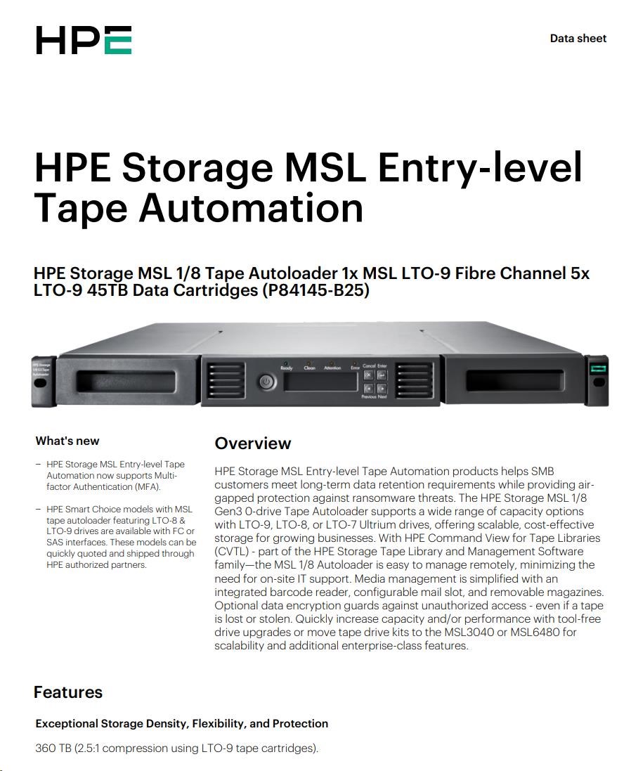 HPE Storage MSL 1/8 Tape Autoloader 1x MSL LTO-9 Fibre Channel 5x LTO-9 45TB Data Cartridges