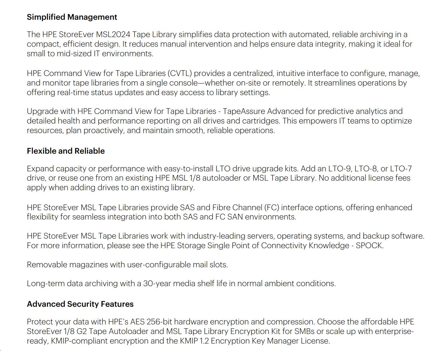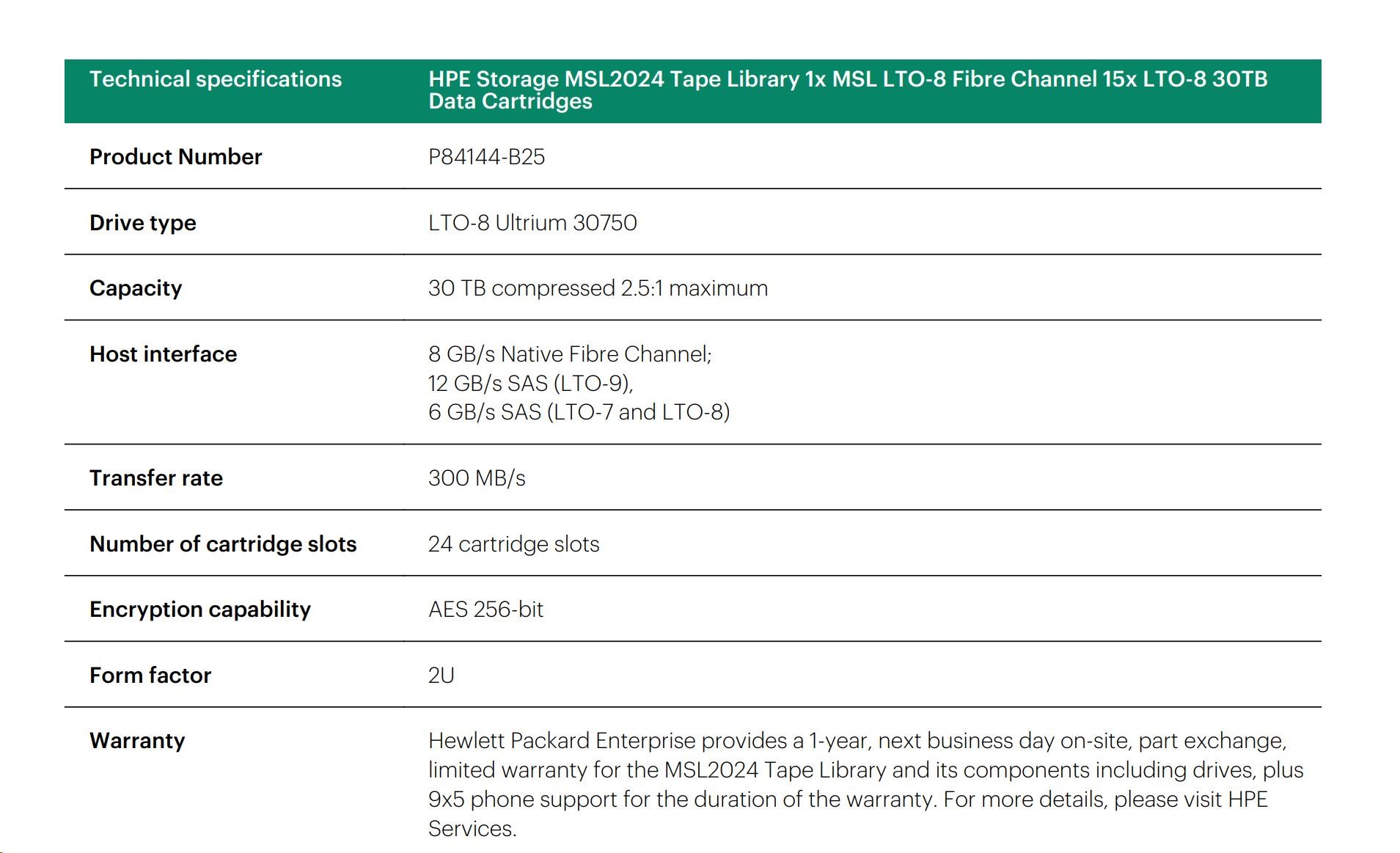 HPE Storage MSL2024 Tape Library 1x MSL LTO-8 Fibre Channel 15x LTO-8 30TB Data Cartridges