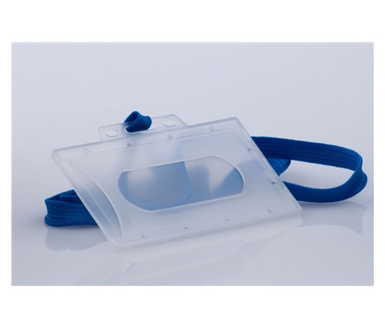 Pevná plastová visačka na kreditnú kartu 54 × 86 mm s modrou šnúrkou. Jedna strana s oválnym otvorom na jednoduché vloženie karty..