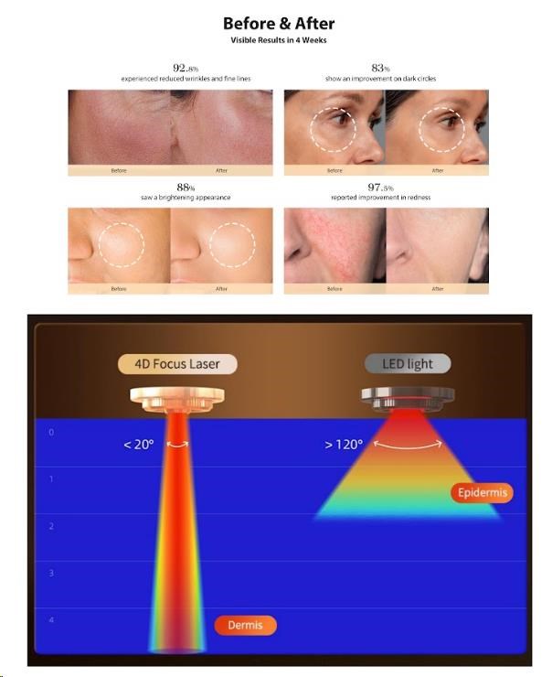 Táto maska nie je len ďalším LED zariadením na trhu. Využíva prelomovú technológiu ultra úzkeho FPT laseru, ktorý je až 6x výkonnejší než bežné LED svetlo a jeho žiarenia prenikajú hlboko do štruktúry pleti. Unikátny 4D systém, tvorený 140 laserovými paprsky, cieli s maximálnou presnosťou na štyri kľúčové zóny tváre. Každá zóna je ošetrená špecifickou vlnovou dĺžkou laseru, aby sa zamerala na konkrétne problémy – od vrások na čele cez tmavé kruhy pod očami až po nosoretné ryhy a povädnutú pleť na tvárach.
