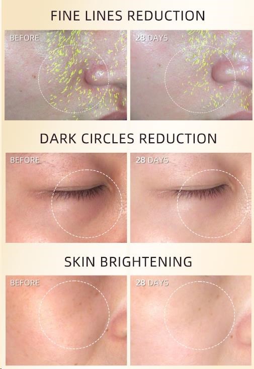 - Klinicky overené zníženie vrások okolo očí o 24,56% a tmavých kruhov o 29,41% za 28 dní.