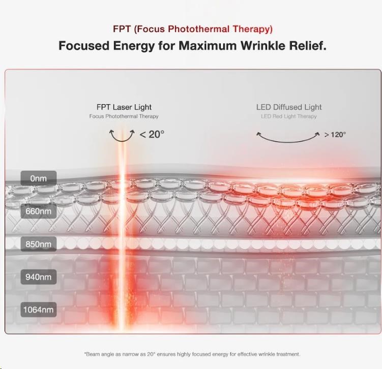Zatiaľ čo väčšina domácich masiek využíva technológiu LED, JOVS 4D ide o krok ďalej. Využíva pokročilú FPT (Focal Photothermal Therapy) technológiu, ktorá koncentruje energiu laseru do úzkych paprskov s uhlom menším než 20°, na rozdiel od viac než 120° u bežných LED. Vďaka tomu prenikajú oveľa hlbšie do dermis – vrstvy pokožky, kde vzniká kolagén. Vďaka 6x vyššej energetickej účinnosti v porovnaní s LED diodami dokáže laser účinnejšie stimulovať bunkovú obnovu a cielene riešiť príčiny starnutia pleti.
