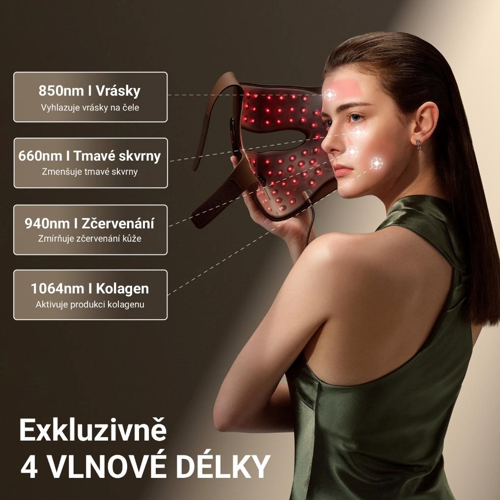 Revolučná 4D laserová technológia – štyri vlnové dĺžky pre komplexné omladenie pleti 4D v2 Laser Mask Jovspredstavuje prelom v domácej laserovej terapii vďaka svojej unikátnej kombinácii štyroch dlhovlnných svetiel – 660 nm, 850 nm, 940 nm a 1064 nm. Každá z týchto vlnových dĺžok pôsobí v inej hĺbke pokožky a zameriava sa na konkrétne problémy – od matnej pokožky a tmavých kruhov pod očami až po stratu pevnosti a hlboké vrásky. Kľúčová inovácia spočíva v využití profesionálnej vlnovovej dĺžky 1064 nm, ktorá bola doteraz k dispozícii len v klinických laserových zariadeniach. Táto technológia preniká hlbšie do dermis, aktivuje produkciu kolagénu a podporuje prirodzenú regeneráciu pokožky. V porovnaní s bežnými LED maskami je až šesťkrát účinnejšia, prináša rýchlejšie a viditeľnejšie výsledky a umožňuje vám dosiahnuť profesionálnu úroveň ošetrenia v pohodlí vášho domova.