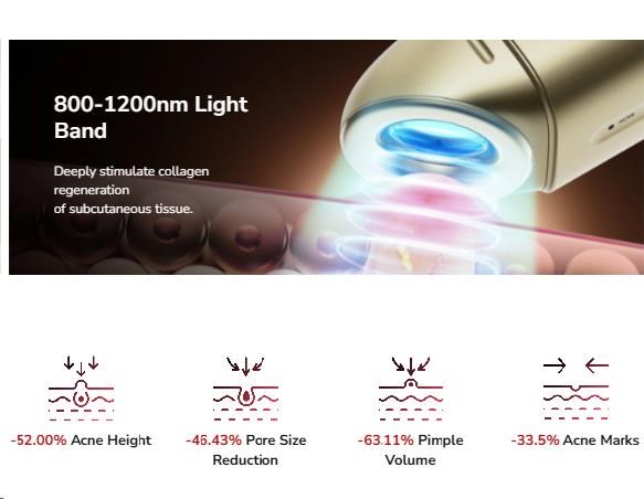 Tento inovatívny prístroj využíva unikátnu "svetelno-biologickú" technológiu na maximálny efekt. Dvojitá rádiová vlna intenzívneho pulzného svetla preniká hlboko do pokožky, kde ničí baktérie Propionibacterium acnes a reguluje produkciu mazu.