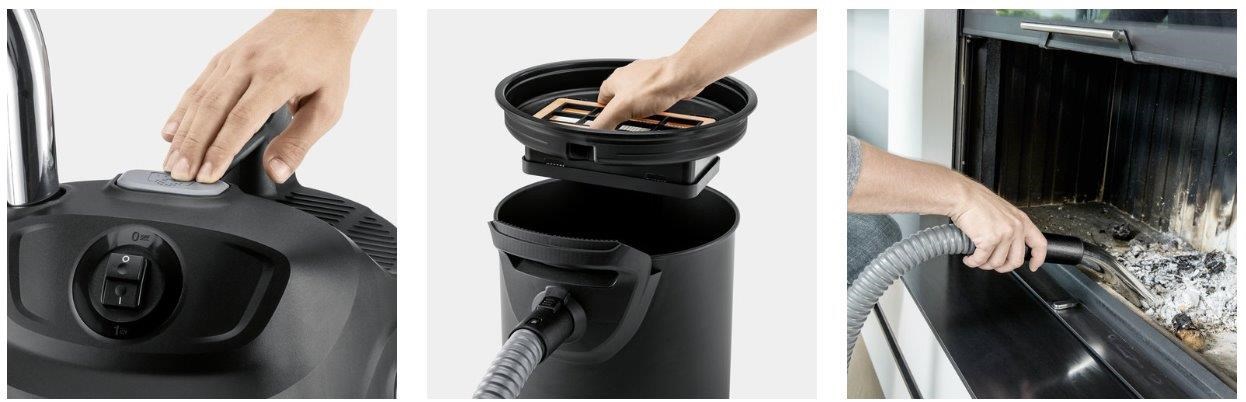 Vysavač na popel s integrovaným čištěním filtru, konstantní sací silou a kovovou nádobou o velikosti 17 l: pro bezpečné odstraňování popela.Silný, vytrvalý, uživatelsky příjemný, mnohostranný a bezpečný: Pro vysavač na vysávání popela a suchých nečistot AD 2 s turbínou 600 Watt je likvidace popela hračkou. Za svou konstantní sací sílu vděčí integrovanému systému na čištění filtru, který stisknutím tlačítka vyfouká zanesený filtr a tím opět zvýší sací výkon. Díky jednodílnému filtračnímu systému s robustním plochým skládaným filtrem a kovovým filtrem na hrubé nečistoty i praktické rukojeti na nádobě lze vysavač pohodlně, rychle a bez jakéhokoli kontaktu s nečistotami vyprázdnit. Kovová nádoba, pružná sací hadice z opleteného kovu a kvalitní nehořlavý materiál nabízejí maximální bezpečnost při vysávání popela. Zkosená ruční trubka umožňuje pracovní komfort a přesvědčí především v rozích a na těžko přístupných místech v komínu. Zbytky popela tak lze bez problémů vysát. Díky kompaktnímu designu vysavač na popel kdykoli uložíte bez nároků na místo a sací hadici pohodlně odložíte.
