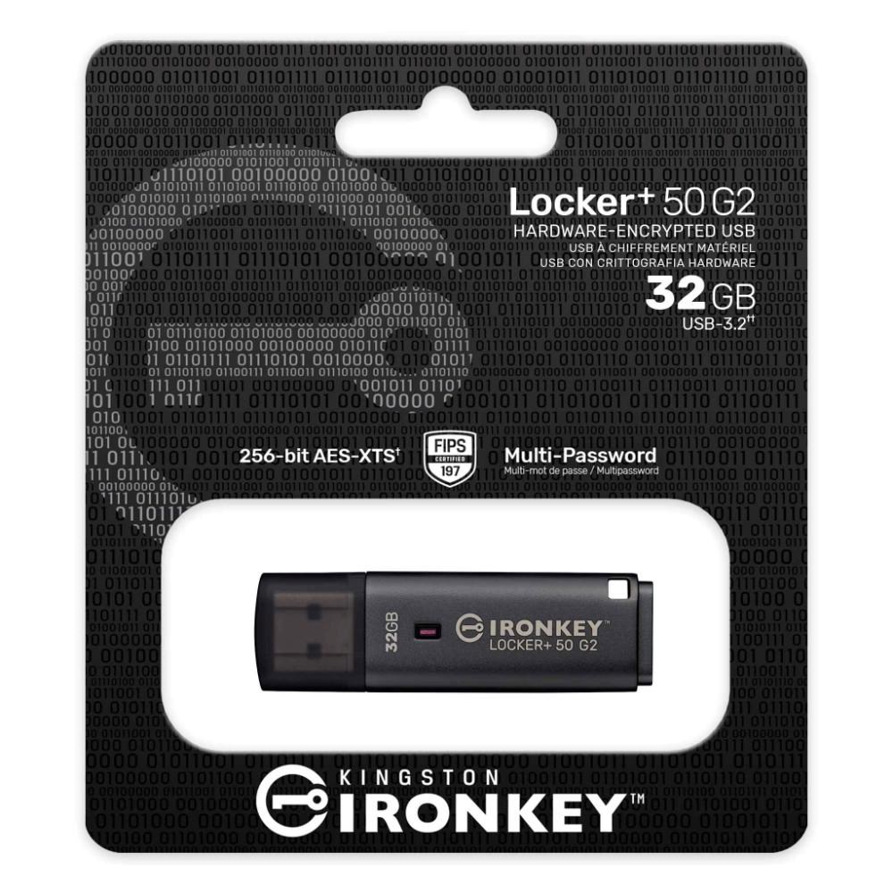 USB flash disk Kingston IronKey Locker+ 50 G2 poskytuje zabezpečení na podnikové úrovni s 256bitovým hardwarovým šifrováním AES s certifikací FIPS 197 v režimu XTS, včetně ochrany proti útokům BadUSB a útokům hrubou silou. LP50 G2 je také kompatibilní s TAA.