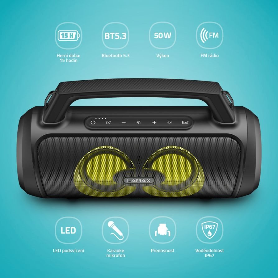 Malé telo a veľký výkon čo naladí aj rádioUdávaj tón každej party s prenosným reproduktorom LAMAX PartyGo1 Play. Jeho neveľké telo so šikovným madlom ukrýva značný výkon 50 W. Kdekoľvek si len spomenieš, naservíruje ti silný, plný a bohatý zvuk vďaka technológii BeatBass®. Či už sa jedná o poriadnu párty alebo záhradnú grilovačku, vždy im dodajú ten správny vibe aj 3 režimy LED podsvietenia a pribalený mikrofón, s ktorým si užiješ super karaoke alebo môžeš akciu moderovať. Bluetooth 5.3 zariadi okamžité spárovanie repráku s akýmkoľvek zariadením a istotu bezchybného prenosu až na 18 m. Pripojiť ho možno ale aj cez USB, microSD, prípadne AUX a vie sa premeniť v powerbanku cez USB-A vstup. Poriadnu muziku si užiješ aj na cestách, batéria repráku vydrží až 15 hodín a vďaka praktickému popruhu si ho pohodlne hodíš cez rameno. Pokiaľ je jeden reprák málo, pomocou True Wireless technológie ho pohodlne spáruješ s ďalším. Nemáš práve po ruke svoj playlist? Využi FM rádio, ktorý ľahko naladíš. Reproduktor podporuje hlasových asistentov a ovládneš s ním aj telefónne hovory.